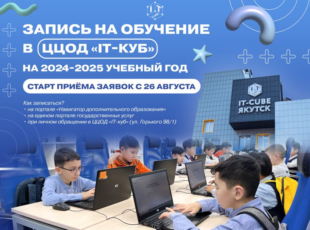 Запись на обучение в ЦЦОД «IT-куб» на 2024-2025 учебный год начнется с 26 августа 2024 года. Алгоритм записи: 1. Выбрать образовательную программу и группу (см. ниже, после информации о записи). 2. Подать заявку одним из способов: • на портале «Навигатор дополнительного образования» https://navigator.e-yakutia.ru/ ; • на едином портале государственных услуг; • при личном обращении в ЦЦОД «IT-куб». 3. Заявки, поданные через Навигатор … Читать далее Уважаемые родители!