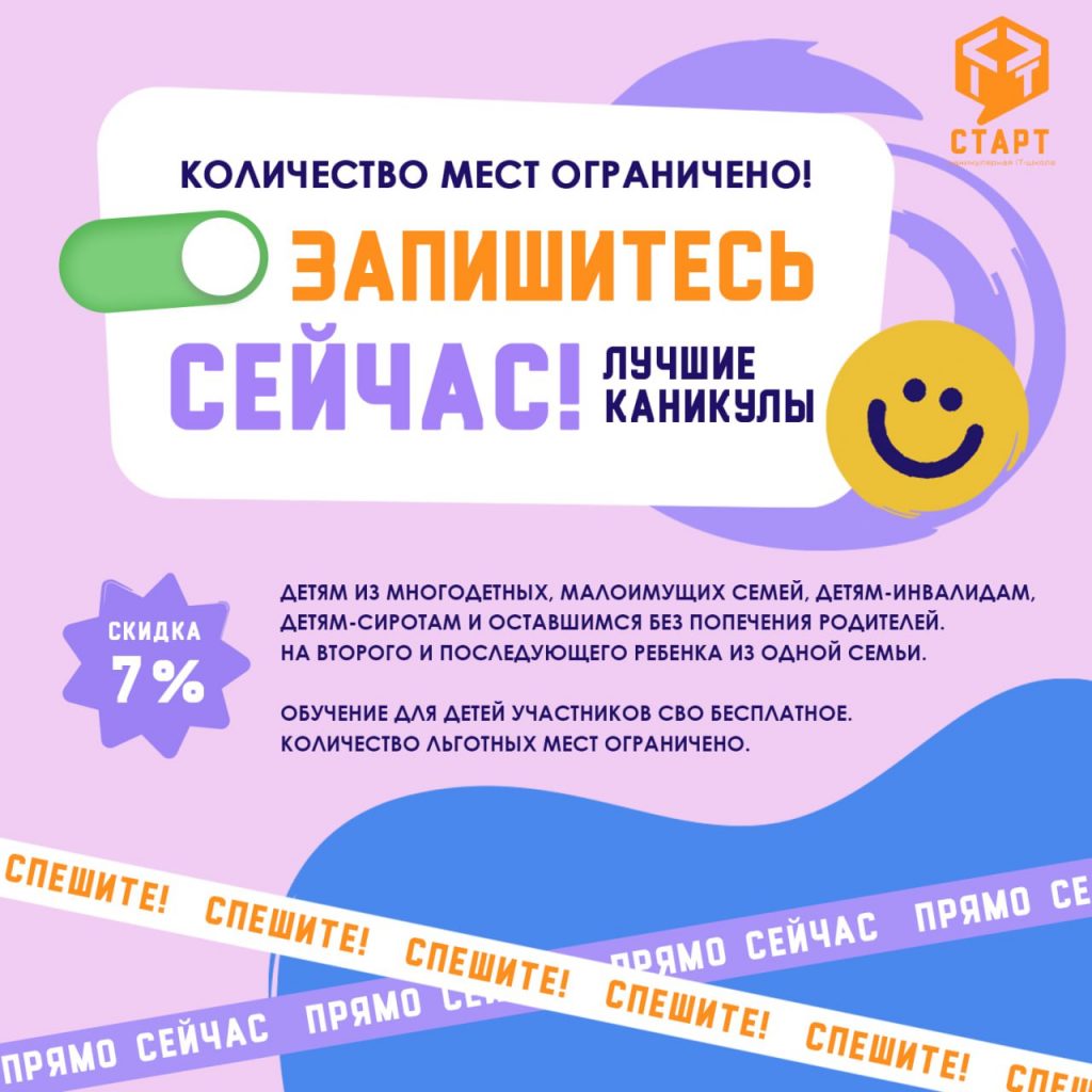 📌 Скидка 7% для детей с особым статусом. Обучение для детей участников СВО бесплатное. Количество льготных мест ограничено.